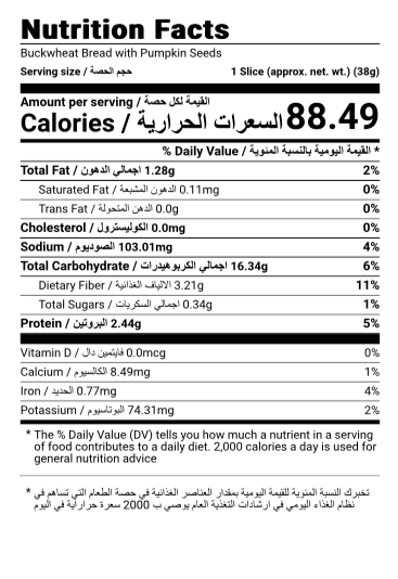 Ingredients: Brown Rice Flour, Sorghum Flour, Buckwheat Flour, Arrowroot, Coconut Flour Pumpkin Seeds, Psyllium Husk, Date Syrup, Yeast, Water, Pink Himalayan Salt, Extra Virigin Olive Oil.