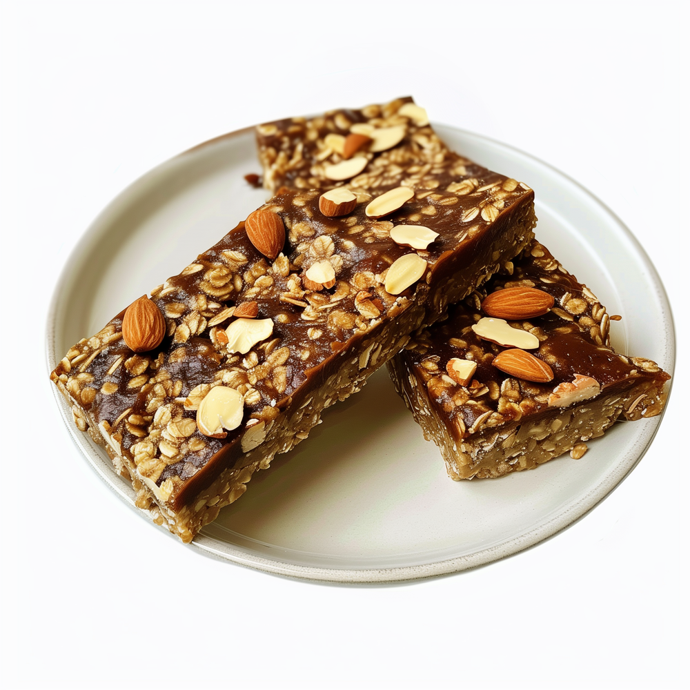 Gluten free, Vegan, No Preservatives, Non-GMO and Low Glycemic Index Date and Oats Based bar, garnished with crunchy almonds.
