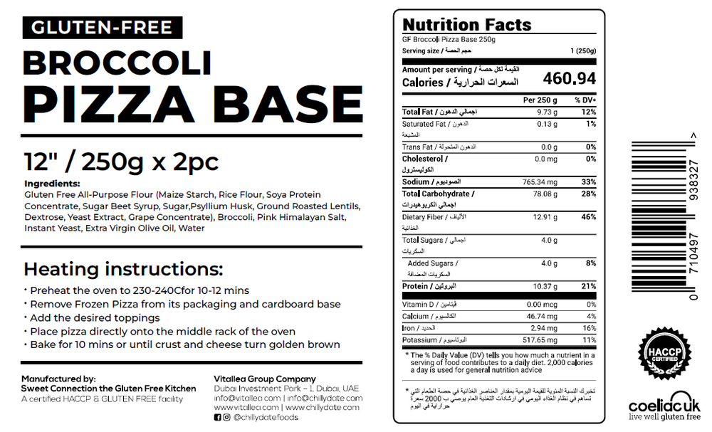 Gluten Free, Vegan, Nut-free and High-Fibre Pizza Base made from Broccoli! Ingredients: GF Flour, Broccoli, Water, Extra Virgin Olive Oil, Yeast, Himalayan Salt, Sugar. Delivery: Room Temp or Frozen (Vacuum