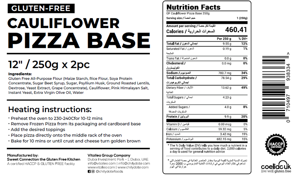 Gluten Free, Vegan, Nut-free and High-Fibre Pizza Base made from Cauliflower! Ingredients: GF Flour, Cauliflower, Water, Extra Virgin Olive Oil, Yeast, Himalayan Salt, Sugar. Delivery: Room Temp or Frozen (Vacuum