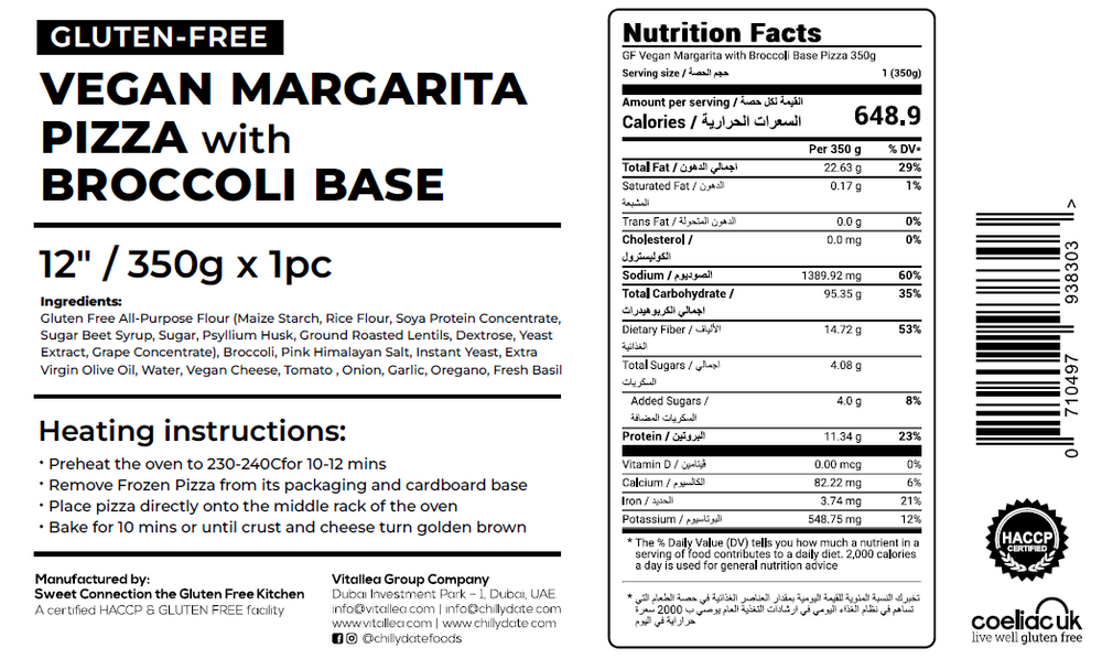 Gluten Free, Vegan, Nut-free and High-Fibre Margarita Pizza with Broccoli Base! Ingredients: GF Flour, Broccoli, Bottled Water, Tomato Sauce, Oregano, Cherry Tomato, Basil, Vegan Mozzarella Cheese, Extra Virgin Olive Oil,