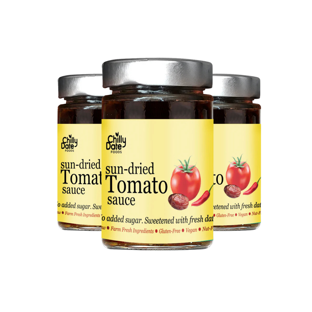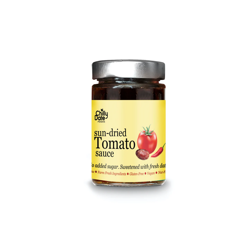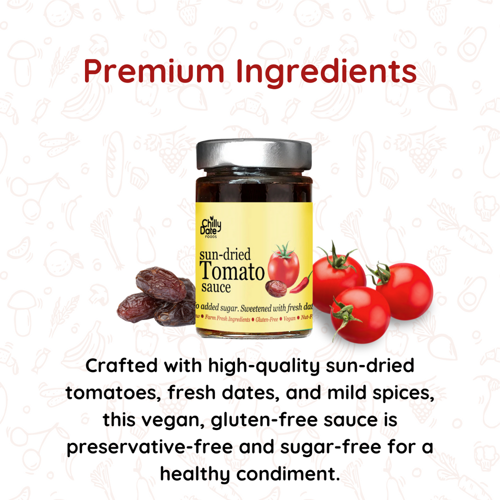 Enjoy the rich, savory flavor of sun-dried tomatoes with our Sun-dried Tomato Sauce. Contents: 1 Sun-dried Tomato Sauce Ingredients: Sun-dried Tomato, Curry Leaves, Green Chilly, Extra Virgin Olive Oil, Date
