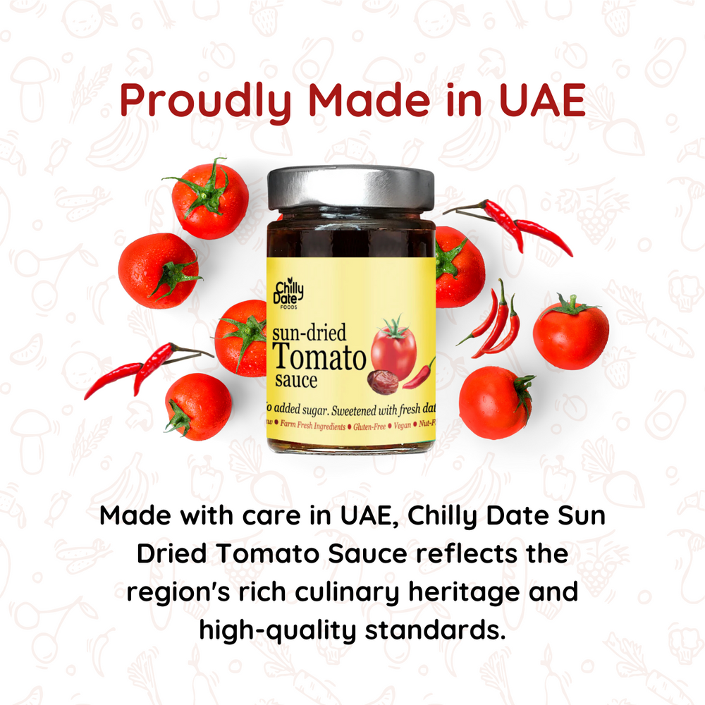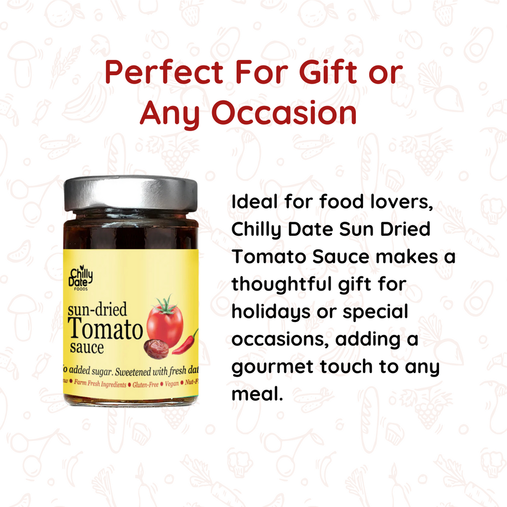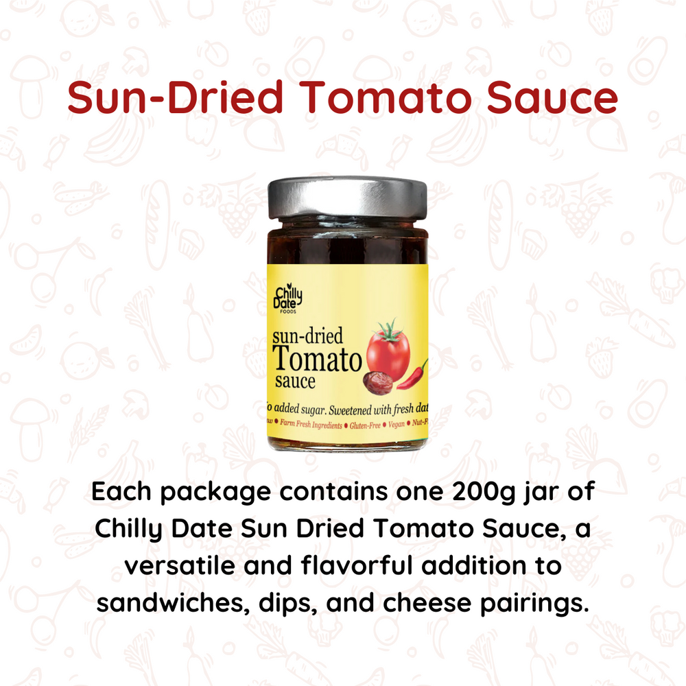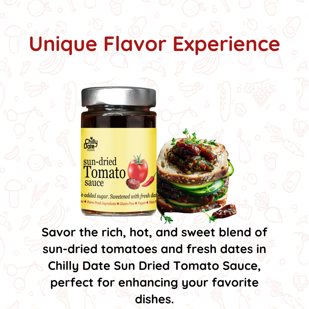 Enjoy the rich, savory flavor of sun-dried tomatoes with our Sun-dried Tomato Sauce. Contents: 1 Sun-dried Tomato Sauce Ingredients: Sun-dried Tomato, Curry Leaves, Green Chilly, Extra Virgin Olive Oil, Date