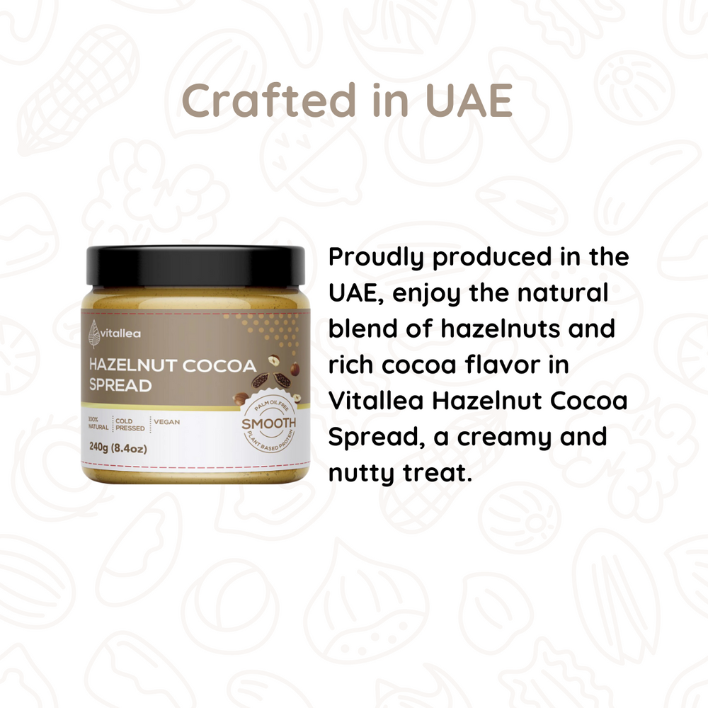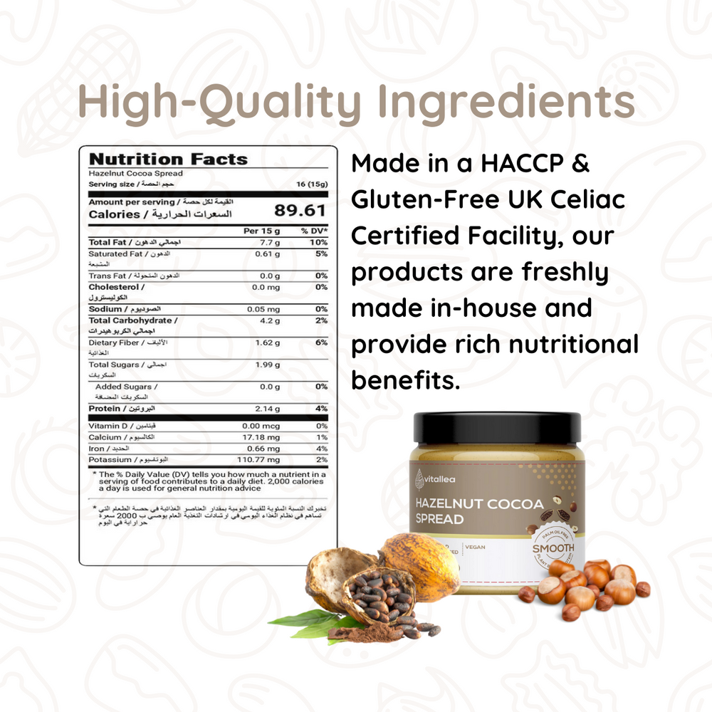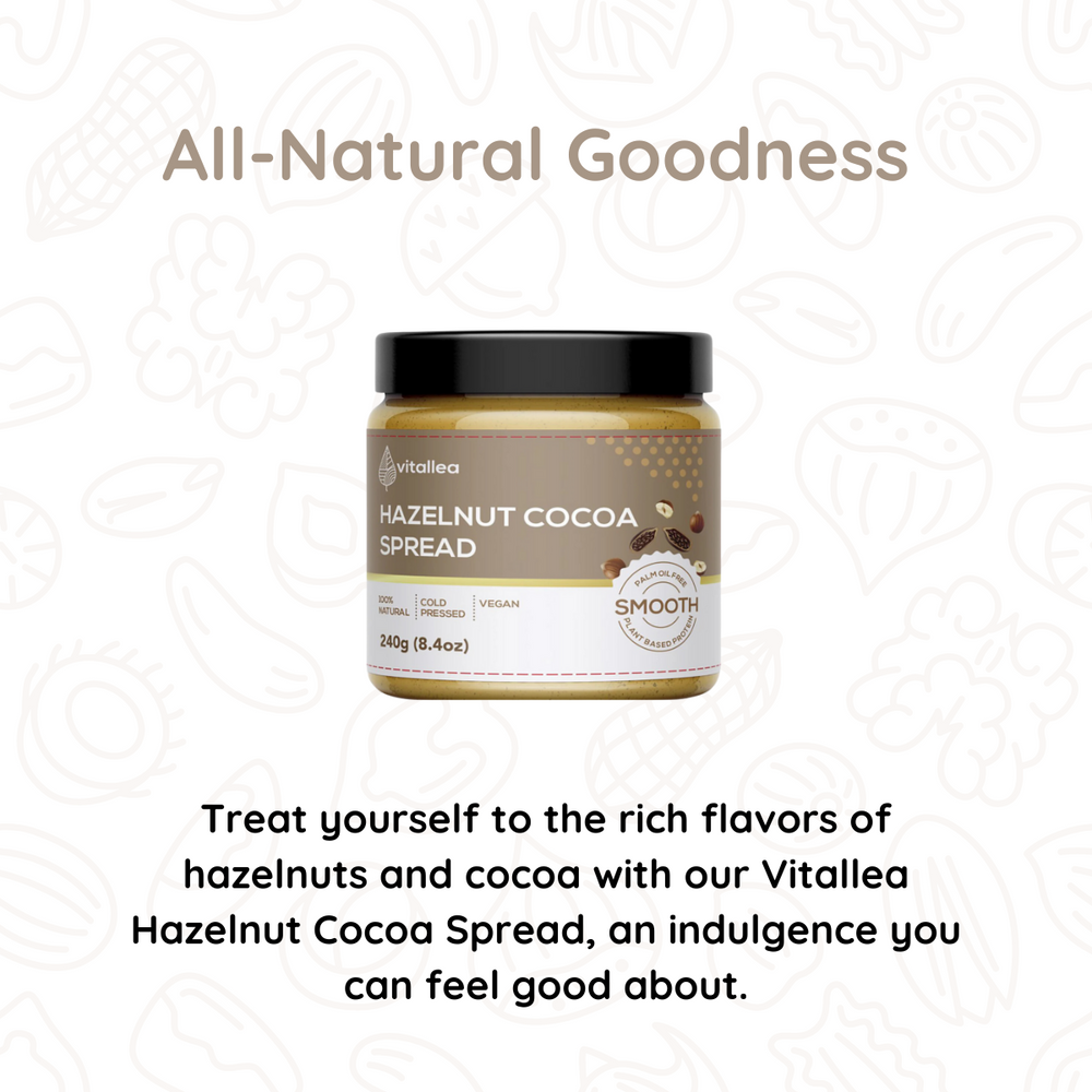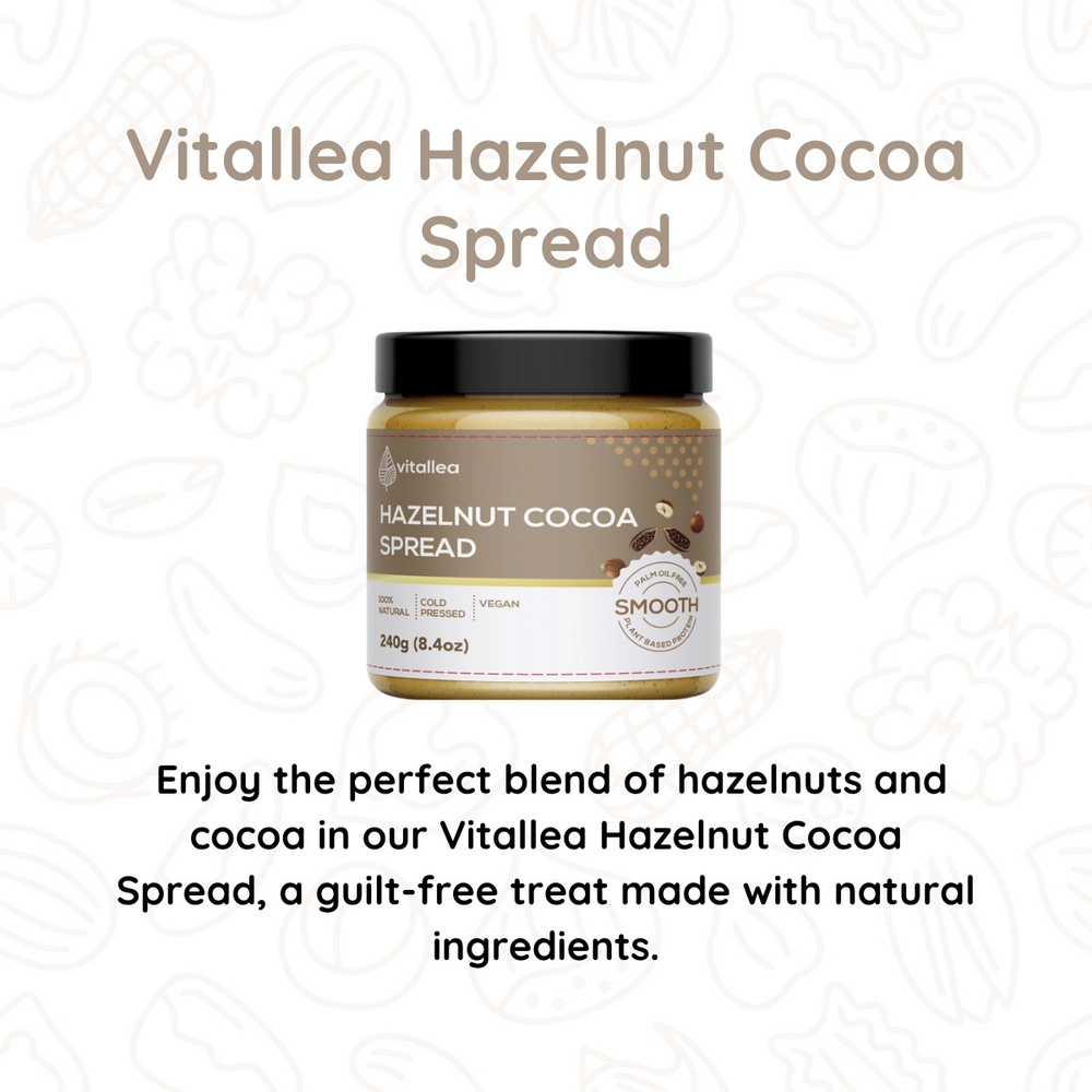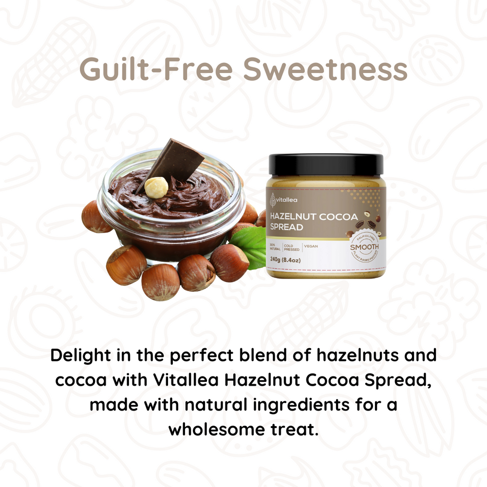 Experience the perfect blend of hazelnuts and cocoa with our Vitallea Hazelnut Cocoa Spread. Made with natural ingredients, it's a guilt-free indulgence that's sure to satisfy your sweet cravings.